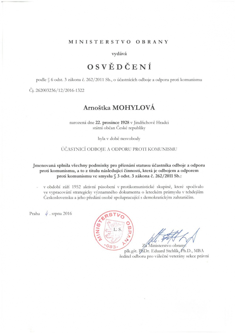 V rámci skupinového procesu byla Arnoštka Mohylová odsouzena rozsudkem Krajského soudu v Praze ze dne 9. 12. 1953 k trestu odnětí svobody v trvání 6 let a k dalším trestům. Z vězení byla podmínečně propuštěna v květnu 1955 na základě prezidentské amnestie.
