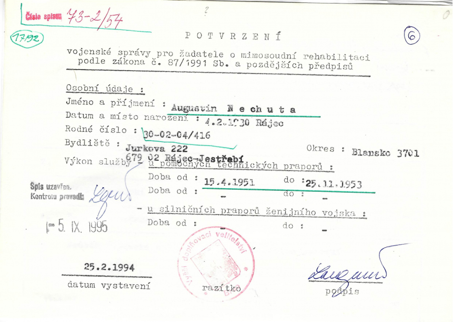 Vojenská služba u PTP zanechala u mnohých „pétépáků“ šrámy na duši, a tak i Augustin Nechuta o ní nerad hovořil, a proto je při koncipování jeho příběhu k dispozici nemnoho údajů. Přesto je důležité jeho osud připomínat – jako svědectví o perzekuci v nelehkých dobách komunistické totality.
