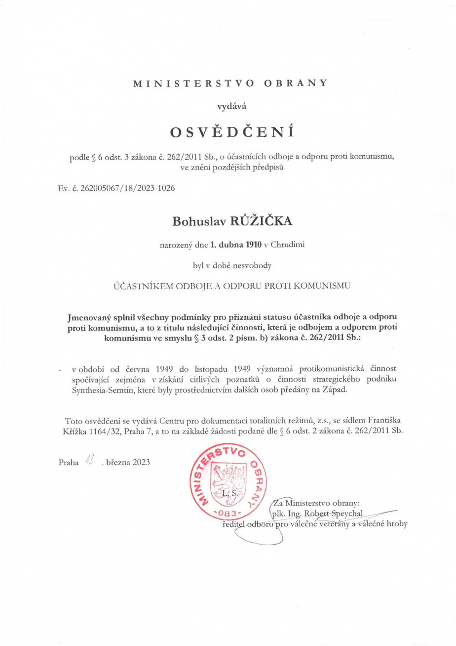 Bohuslav Růžička (nar. 1. 4. 1910 v Chrudimi) působil jako technický úředník a vedoucí oddělení v národním podniku Synthesia-Semtín. Od března 1946 do února 1948 byl členem Československé strany národně socialistické. Po komunistickému puči se rozhodl proti nastupující totalitě vymezit tím, že poskytl řadu poznatků ze zaměstnání svému známému Karlu Vlasákovi, který přislíbil, že zajistí jejich předání do americké okupační zóny v Německu. V červnu 1949 sdělil Růžička Vlasákovi např. informace o denní výrobě různých kyselin v Synthesii a hovořil rovněž o chystaných zkouškách bezpečnostního protileteckého zařízení. Při jedné z dalších schůzek pak Vlasákovi nakreslil podrobný plánek strategického podniku s vyznačením skladiště střelných zbraní.