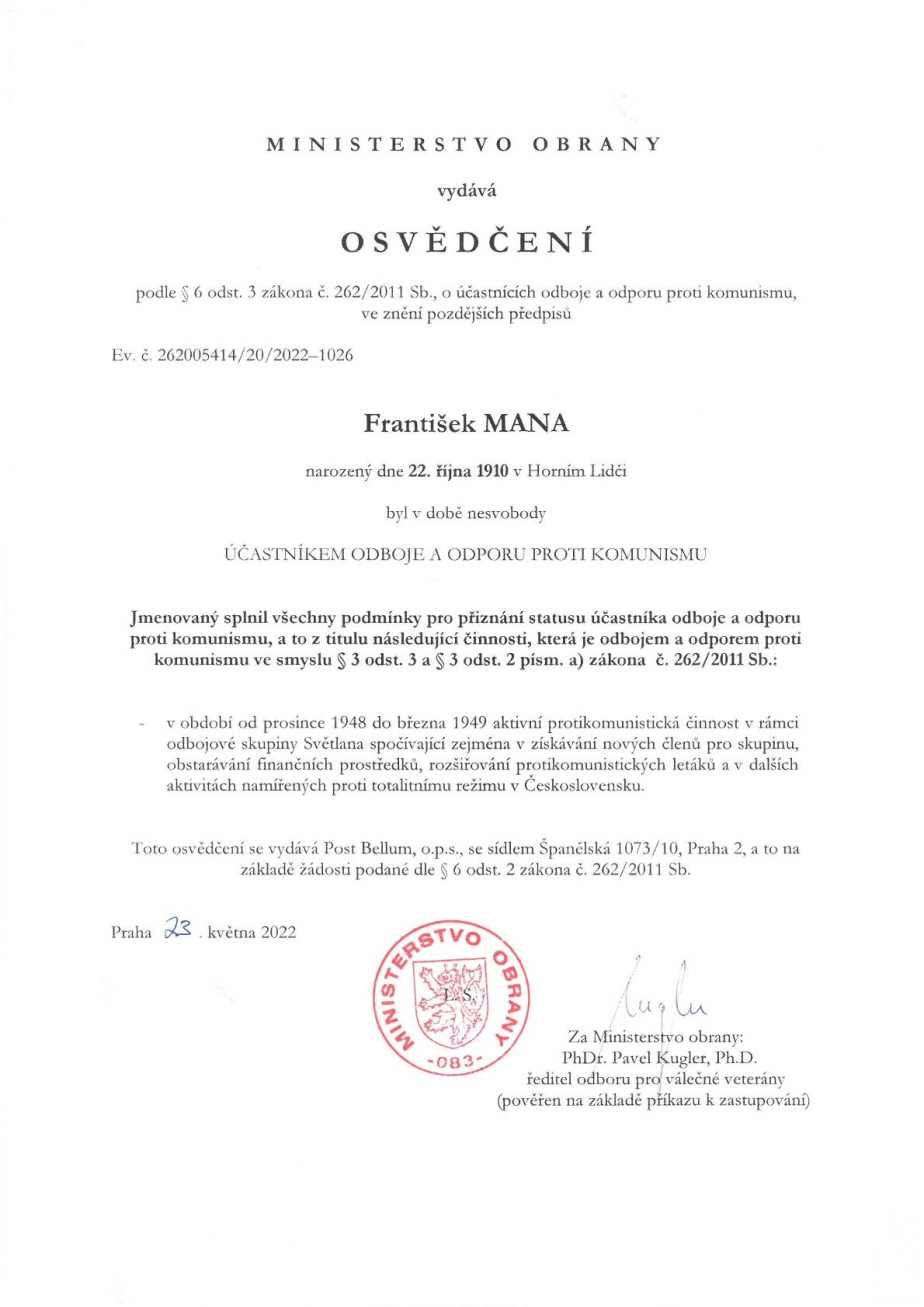 František Mana (nar. 22. 10. 1910 v Horním Lidči) pocházel ze zemědělské rodiny, sám se ovšem v dospělosti živil jako autodopravce. Během německé okupace se choval vlastenecky, když ve svém okolí zásoboval partyzány potravinami, za což později získal písemné uznání generála Ludvíka Svobody. Krátce po osvobození Československa vstoupil František Mana do KSČ, a to i přesto, že byl praktikujícím katolíkem. Již v roce 1947 však poznal svou chybu a řady komunistů opustil.