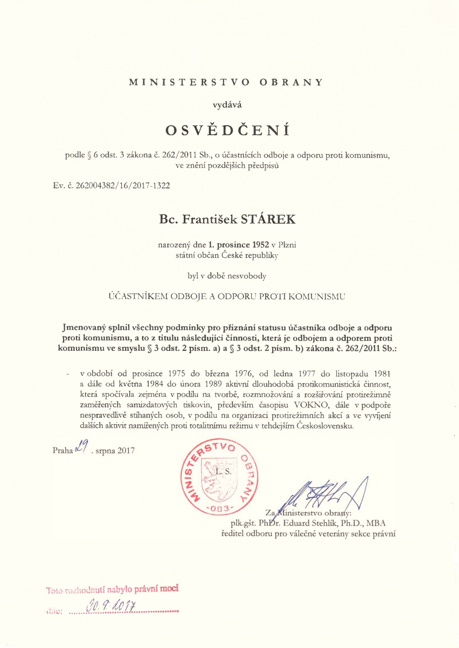 Roku 1976 normalizační justice účelově kriminalizovala členy skupiny Plastic People i některé další undergroundové umělce a organizátory jejich vystoupení. Pro Františka Stárka, který patřil k pořadatelům hudebního večera písničkářů Karla Charlieho Soukupa a Svatopluka Karáska dne 13. 12. 1975 v Přešticích, spojeného s přednáškou Ivana Martina Jirouse, to znamenalo šest měsíců ve vyšetřovací vazbě. Tvrdé postihy přispěly k tomu, že se z undergroundového hnutí stal od poloviny sedmdesátých let jeden z hlavních opozičních proudů. František Stárek se jako signatář Prohlášení Charty 77 účastnil činnosti této nezávislé občanské iniciativy, mimo jiné v rámci kolektivu mluvčích Charty a při organizování jejích diskusních fór. Spolupracoval s Výborem na obranu nespravedlivě stíhaných, zapojil se do Polsko-československé solidarity i řady dalších protirežimních aktivit.