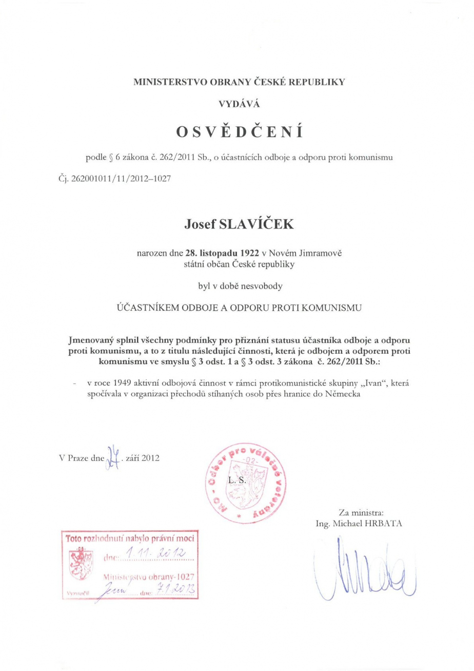 Pád nenáviděného režimu přinesl Josefu Slavíčkovi zaslouženou soudní rehabilitaci. Stalo se tak usnesením Krajského soudu v Hradci Králové ze dne 21. 9. 1990. V září 2012 byl ministerstvem obrany oceněn osvědčením účastníka odboje a odporu proti komunismu a byl mu rovněž přiznán status válečného veterána.🏅 Zemřel dne 19. 2. 2015.