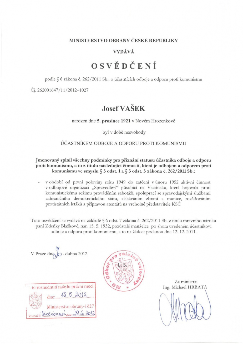 Josef Vašek (nar. 5. 12. 1921 v Novém Hrozenkově) patřil po únoru 1948 k těm mladým lidem, kteří se rozhodli aktivně vzdorovat nastupující komunistické totalitě. Společně se svými kamarády Janem Lukášem a Luďkem Fajkusem se domluvili, že podniknou sabotážní akce. Získali trhavinu s rozbuškou a dne 27. 5. 1949 ve večerních hodinách položili menší nálož na koleje vedoucí ze Vsetína do místní zbrojovky v Jasenicích. Výbuch nikoho nezranil, pouze poškodil kus kolejnice.