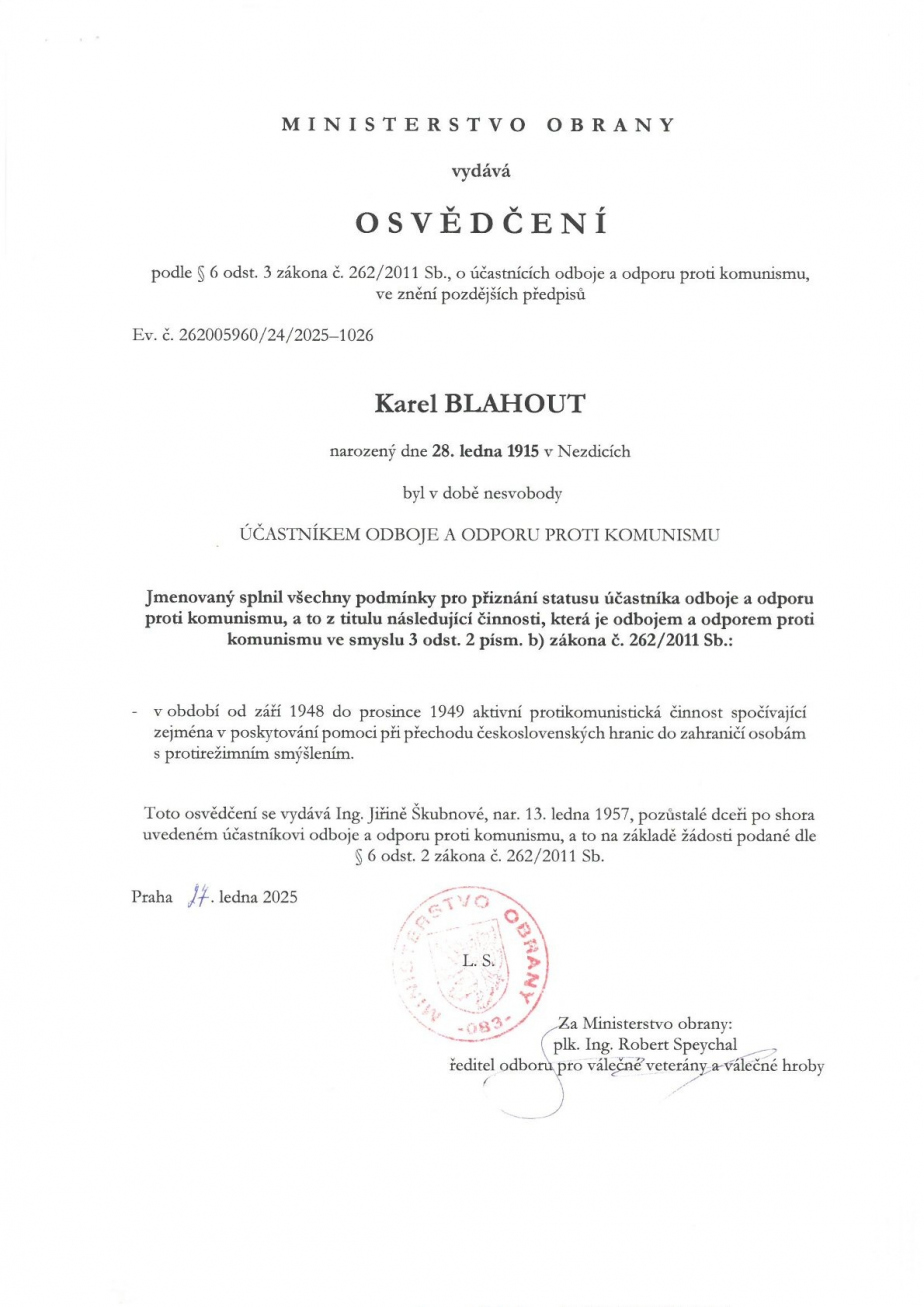 Karel Blahout (nar. 28. 1. 1915 v Nezdicích, část Zaluží) po válce hospodařil v blízkosti státních hranic na Šumavě v malé obci Červená u Kašperských Hor č. p. 38 jako malorolník se svou manželkou Annou a měl zde i malý hostinec. Politicky se projevovala jeho hluboká křesťanská víra, která vedla i k členství v Lidové straně. Po komunistickém puči v únoru 1948 spolupracoval s Dr. Mrkvičkou z Prahy, od kterého přebíral instrukce a začal pomáhat s přechodem státní hranice ohroženým osobám, neboť podrobně znal terén šumavských hvozdů. Od září 1948 až do konce roku 1949 pomohl celkem devíti osobám k útěku na Západ. Mezi nimi byl např. hrabě Otakar Lobkowicz. Karel Blahout všechny zájemce o život ve svobodném světě bezpečně dovedl ke státní hranici, některým z nich také poskytl kompas s osvětlením pro lepší orientaci v terénu.
