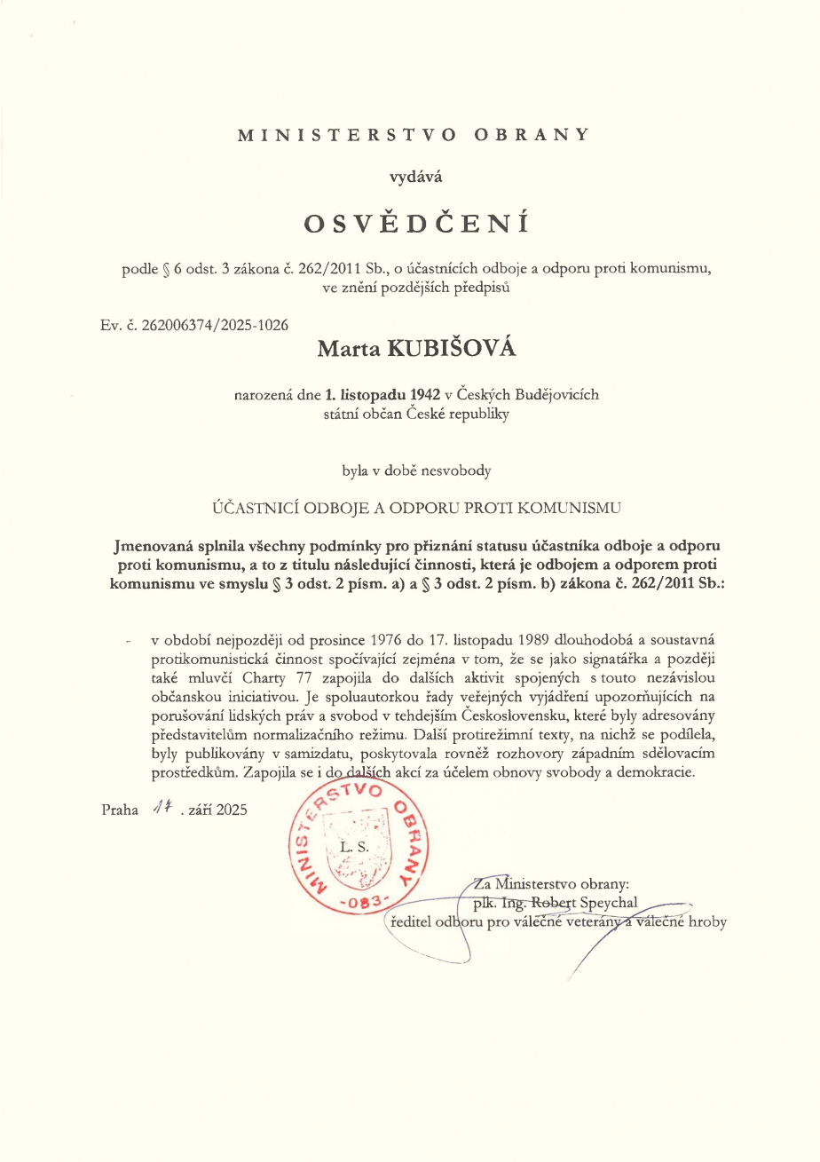 Marta Kubišová byla od března 1976 sledována Státní bezpečností pod krycím jménem „Chalupnice“. Systematický nátlak na její osobu v podobě opakovaného předvolávání k výslechům pokračoval i poté, co na funkci mluvčí na podzim 1978 rezignovala z důvodu těhotenství. Dne 10. 12. 1988 zpívala Marta Kubišová státní hymnu na jediném povoleném protirežimním shromáždění, které bylo uspořádáno ke Dni lidských práv na Škroupově náměstí v Praze. O necelý rok později se aktivně zapojila do listopadových událostí, které znamenaly definitivní pád komunistické totality.
