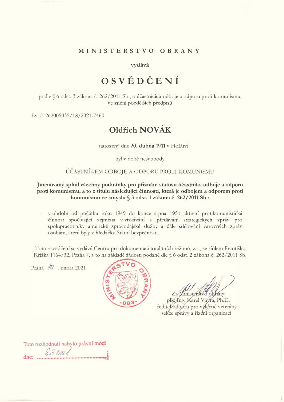 Oldřich Novák byl dne 1. 11. 1951 zatčen a následně odsouzen v procesu „František Havlíček a spol.“ rozsudkem Státního soudu v Praze ze dne 29. 5. 1952 pro trestné činy vyzvědačství a sabotáže k doživotnímu trestu odnětí svobody. Amnestií prezidenta republiky ze dne 9. 5. 1955 mu byl snížen trest doživotního vězení na 25 let odnětí svobody. Na základě další amnestie ze dne 9. 5. 1960 došlo k prominutí zbytku trestu pod podmínkou na 10 let. Vězeňské brány opustil dne 10. 5. 1960. V srpnu 1968 podal Oldřich Novák návrh na přezkumné řízení dle zákona o soudní rehabilitaci č. 82/1968 Sb., který v době tzv. normalizace vzal svým přípisem ze dne 10. 7. 1972 zpět. Zemřel dne 10. 5. 1982 v Klatovech.