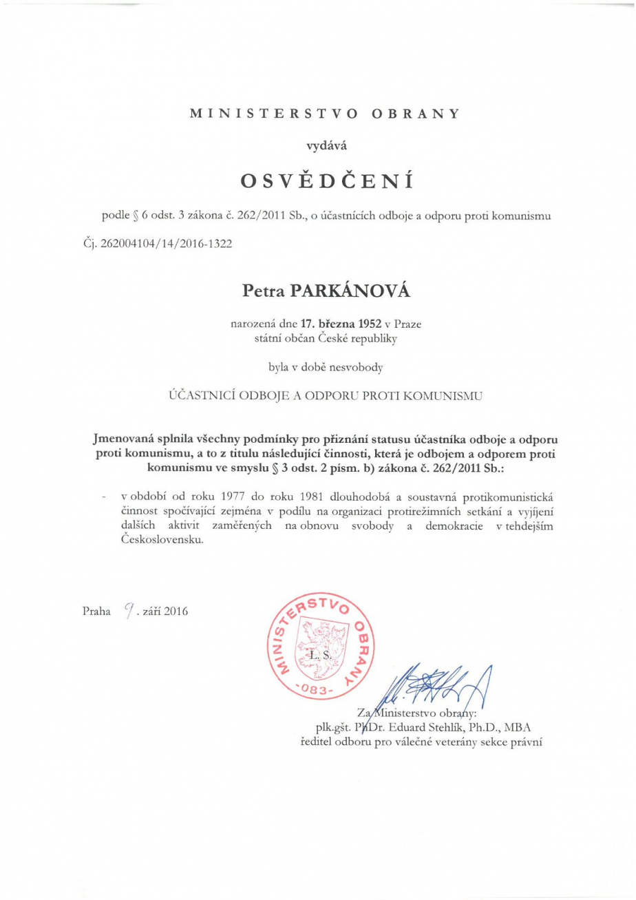 Petra Parkánová (nar. 17. 3. 1952 v Praze) se proti komunistickému režimu osobně vymezila na počátku roku 1977, kdy podepsala Prohlášení Charty 77, čímž se dostala do hledáčku bezpečnostních složek. V červenci téhož roku byla předvolána na StB, kde při výslechu potvrdila, že Chartu signovala a nadále stojí za jejím obsahem. V srpnu 1977 se pak svým podpisem připojila k žádosti o povolení manifestace před budovou ministerstva spravedlnosti za propuštění disidenta Jana Prince na svobodu.